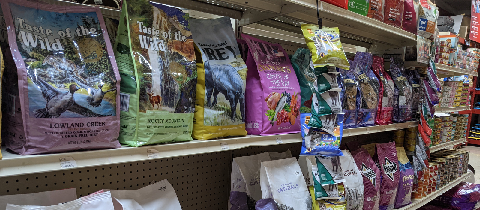 We carry flea medications (both liquid applications and flea collars), tick medication, dewormers, grooming tools and aids such as brushes, nail trimmers, and shampoos, external care supplies such as paw care, skin care, itch relief sprays, ear and eye care, and blood stoppers, dietary supplements and vitamins, and other internal health supplies, including for hairball assistance. We're also a local source for salmon and other fish oils to assist with your pet's skin and coat health.