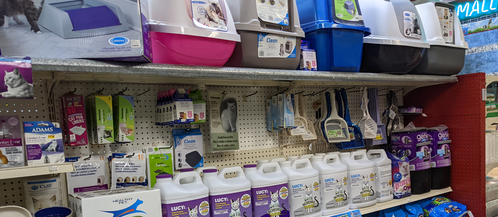 We carry a variety of toys, from scratching boards to catnip toys to balls and other chase and fetching toys. When it comes to treats, we have a variety of tooth health and training treats from Greenies to freeze dried fish. We also have cat beds, travel crates, litter boxes, litter (clay, paper, and wood) and waste disposal supplies, collars and leashes, harnesses, feeding and watering supplies, and more.