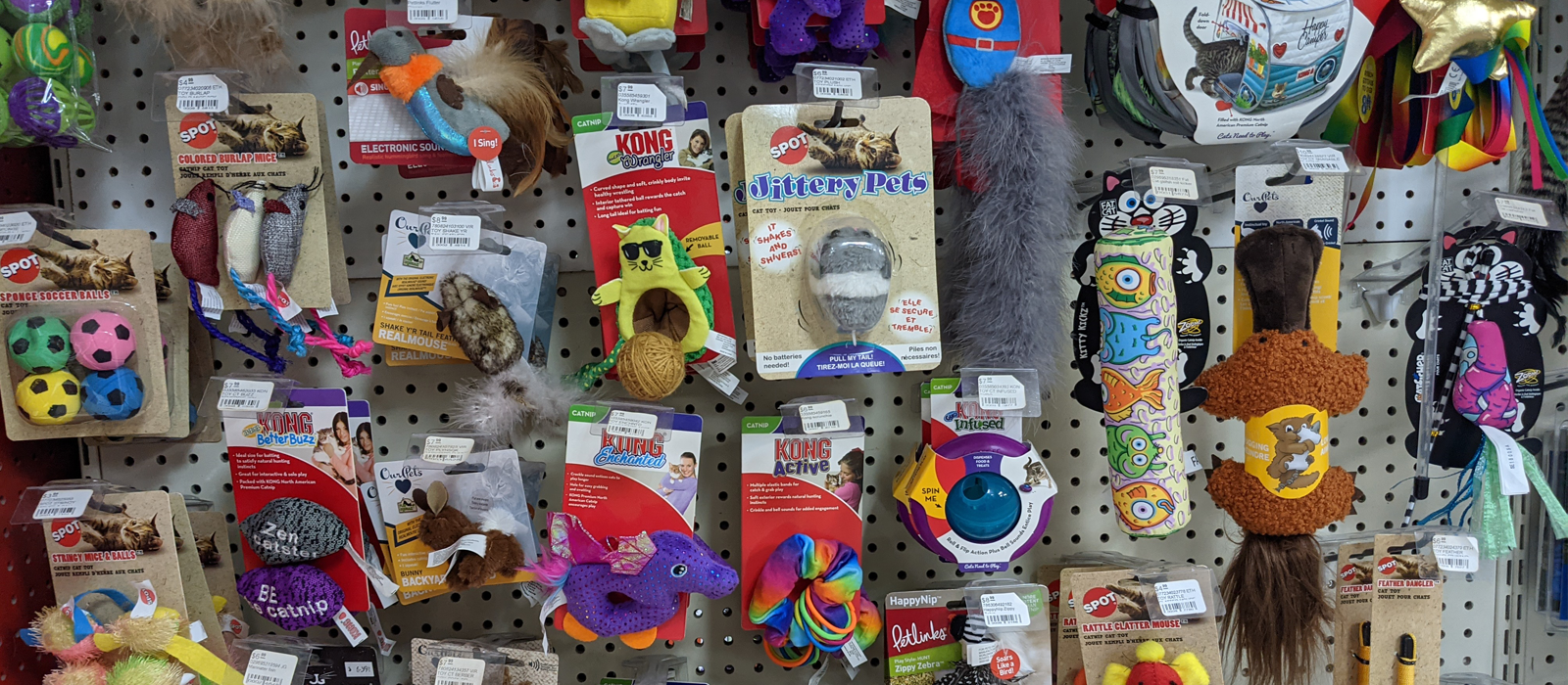 Looking for new toys for your pets? Needing treats on hand or for training? We've got you covered! We also carry pet beds, feline furniture, grooming supplies, and a variety of cat feeding and watering bowls.